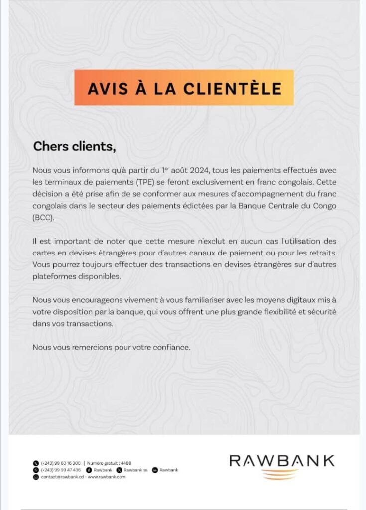 « Tous les paiements effectués avec les terminaux de paiement électronique (TPE) se feront exclusivement en franc congolais à partir du jeudi 1er août 2024 », a annoncé Rawbank.