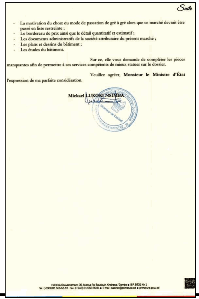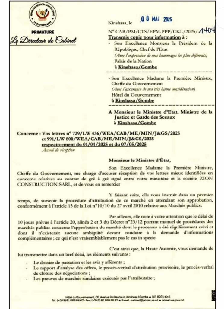 Selon une correspondance du directeur de cabinet de la première ministre, datée du 8 mai 2025, le gouvernement exige du ministre Constant Mutamba des éclaircissements complets sur ce projet attribué de gré à gré à l’entreprise Zion Construction, sans consultation préalable de la Primature.