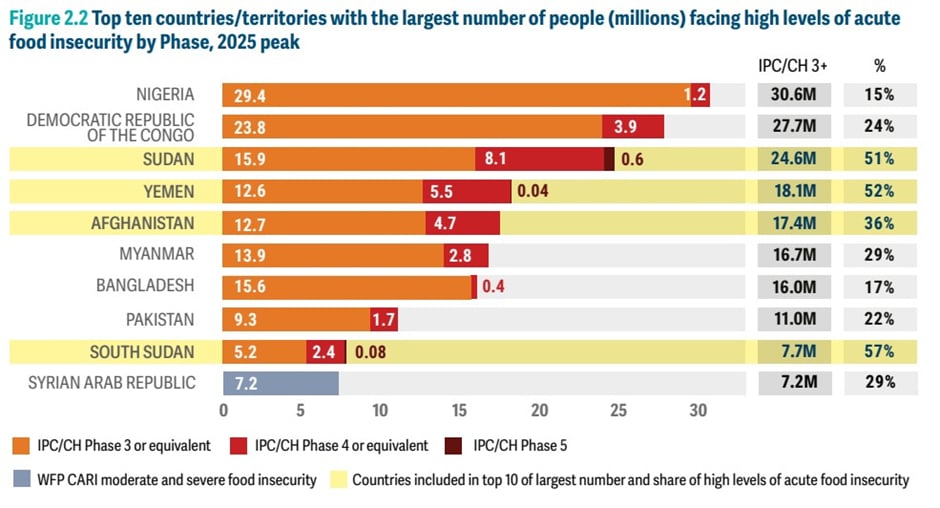 La République démocratique du Congo concentre l’une des crises alimentaires les plus sévères de la planète. Selon le Rapport mondial sur les crises alimentaires (Global Report on Food Crises, GRFC), publié vendredi 24 avril 2026, le pays compte 27,7 millions de personnes en situation d’insécurité alimentaire aiguë en 2025 (IPC/CH Phase 3+), se classant au deuxième rang mondial, derrière le Nigeria (30,6 millions) et devant le Soudan (24,6 millions).